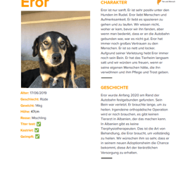 Seit 2016 arbeitet JETA Tier und Mensch mit Straßentieren in Albanien. Wir helfen den Hunden die nicht mehr auf der Straße überleben können und stellen sicher, dass sie allen Anforderungen entsprechen um ins Ausland zu kommen. Leider ist die Adoptionsquote, vor allem in Albanien, sehr gering, was uns dazu zwingt Adoptionsfamilien im Ausland zu suchen.