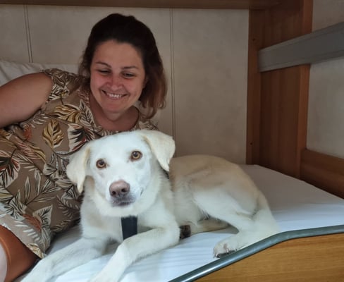 Sie besuchten zunächst Molly und Rixhesko im Tierheim, um zu helfen, aber als sie Ginny trafen, verliebten sie sich ineinander und innerhalb einer Woche lebte Ginny auf Eloises und Robs bequemem Sofa am Strand in Durres.