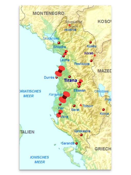 Unsere große Tierliebe, einhergehend mit unserer mehrjährigen Erfahrung auf diesem Gebiet, zeigt sich in den zahlreichen Projekten, an denen wir in verschiedenen Städten in Albanien wie Fieri und Durres federführend beteiligt sind (siehe nebenstehende Karte).